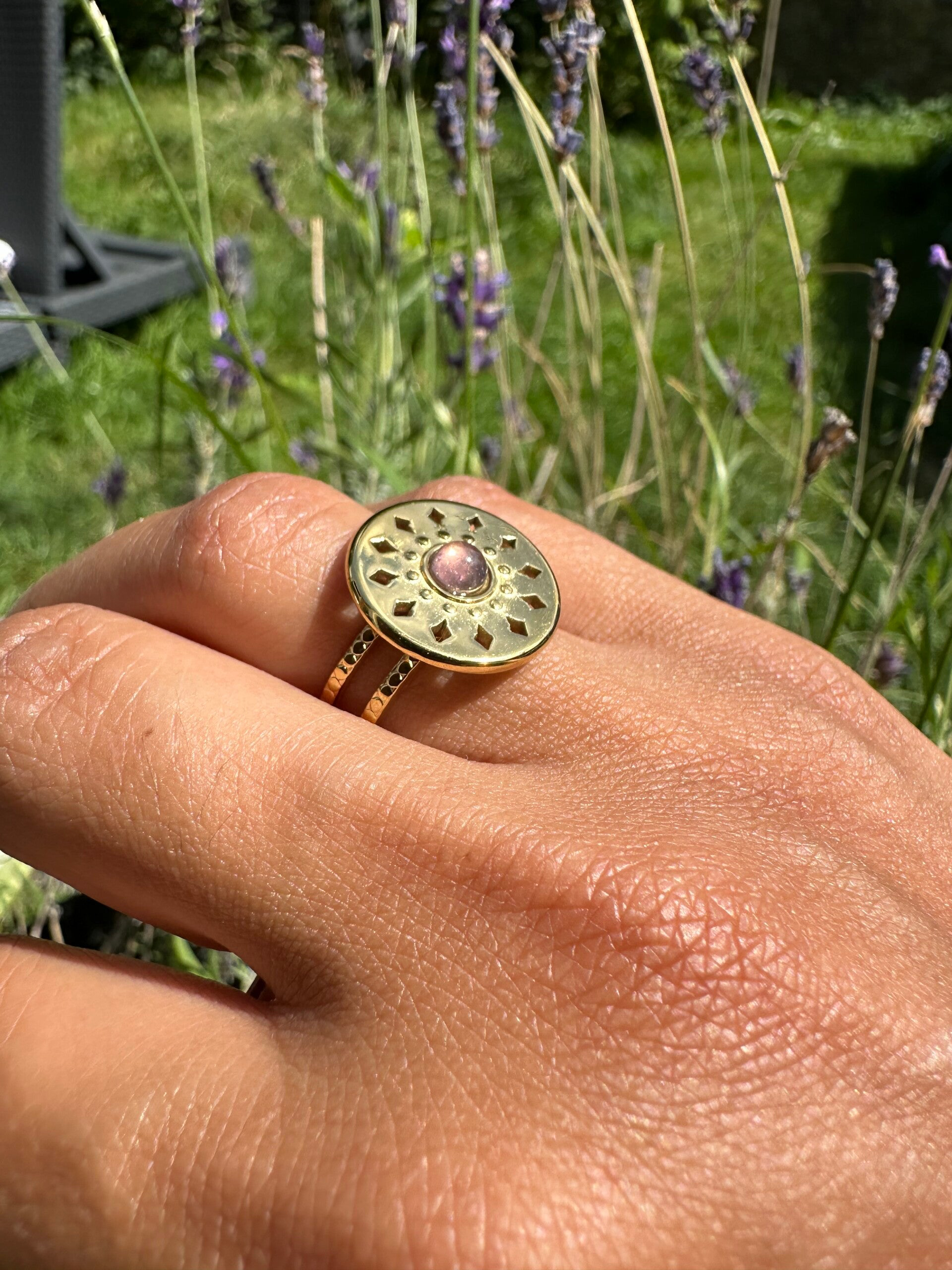Discrète et raffinée, cette bague met en valeur une améthyste naturelle, pierre d’intuition, de paix et de clarté mentale.